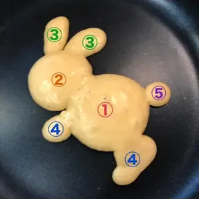 2. Heat a frying pan over medium heat, let cool slightly on a damp cloth, then lower the heat to low and pour the batter into the pan, making 2 round pancakes (body and face), 2 oval pancakes (legs), and 2 long, thin pancakes (ears). Cook each for 2 to 3 minutes, and when small bubbles appear, flip immediately and cook on low heat for another 1 to 2 minutes.
