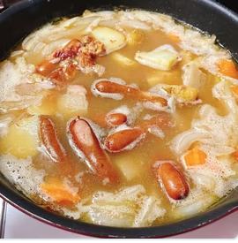 Ingredients (4 servings): About 10 oz./300g of leftover oden ingredients 1 onion 1 carrot 1 box of curry roux Water - the amount shown in the roux minus the broth 2 tbsp of olive oil A dash of mirin sweet cooking rice wine (optional) A dash of milk (optional) 4 bowls of cooked rice